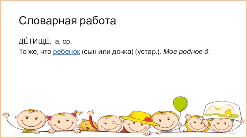 Словарная работаДЕ́ТИЩЕ, -а, ср.То же, что ребенок (сын или дочка) (устар.). Мое родное д.