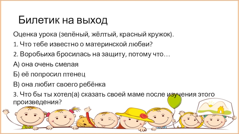Билетик на выходОценка урока (зелёный, жёлтый, красный кружок).1. Что тебе известно о материнской любви?2. Воробьиха бросилась на
