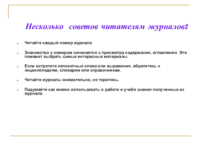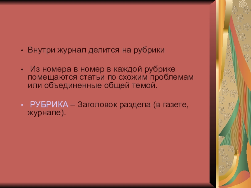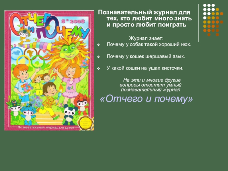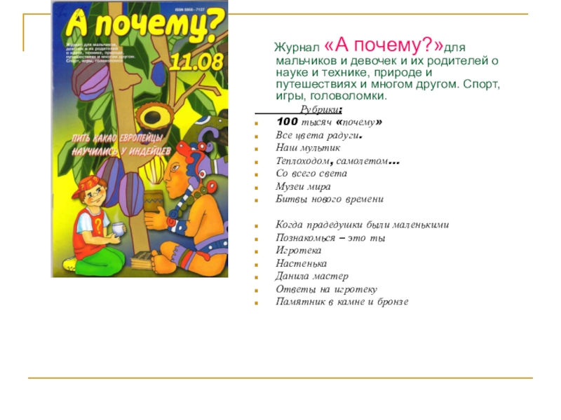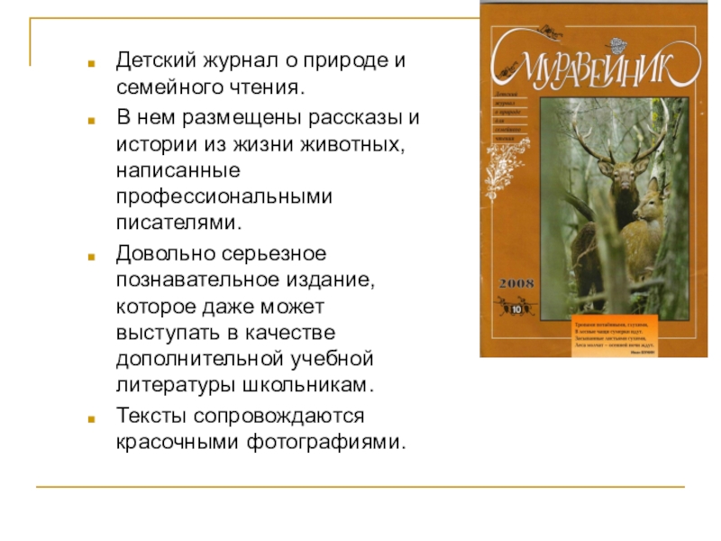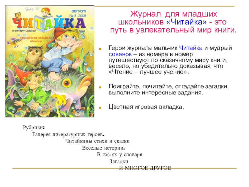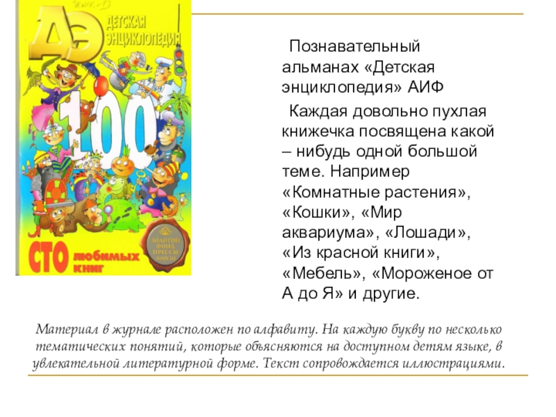 Материал в журнале расположен по алфавиту. На каждую букву по несколько тематических понятий, которые объясняются на доступном детям языке, в увлекательной литературной форме. Текст сопровождается иллюстрациями.