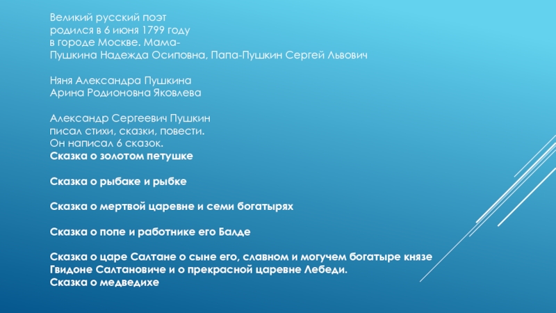 Великий русский поэт родился в 6 июня 1799 году в городе Москве. Мама-Пушкина Надежда Осиповна, Папа-Пушкин Сергей Львович Няня Александра Пушкина Арина Родионовна Яковлева Александр Сергеевич Пушкин писал стихи, сказки, повести.Он написал 6 сказок.Сказка о золотом петушке Сказка о