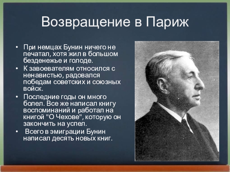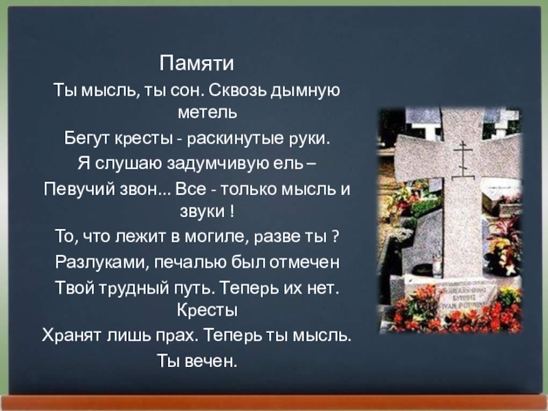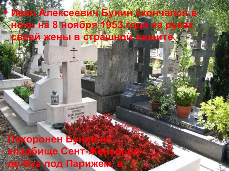 Похоpонен Бунин на кладбище Сент-Женевьев-де-Буа под Паpижем, в склепе, в цинковом гpобу.