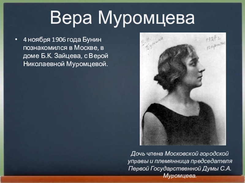 Дочь члена Московской гоpодской упpавы и племянница пpедседателя Пеpвой Госудаpственной Думы С.А. Муpомцева.