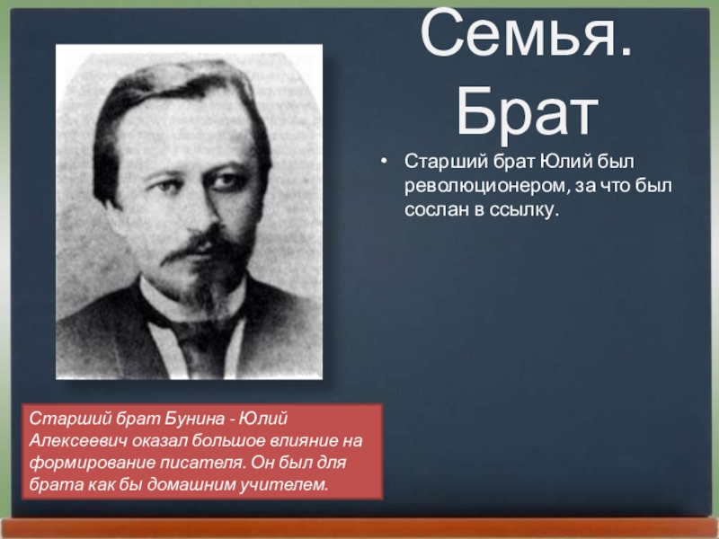 Старший брат Бунина - Юлий Алексеевич оказал большое влияние на формирование писателя. Он был для брата как бы домашним учителем.