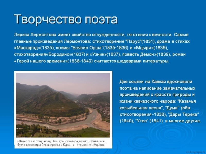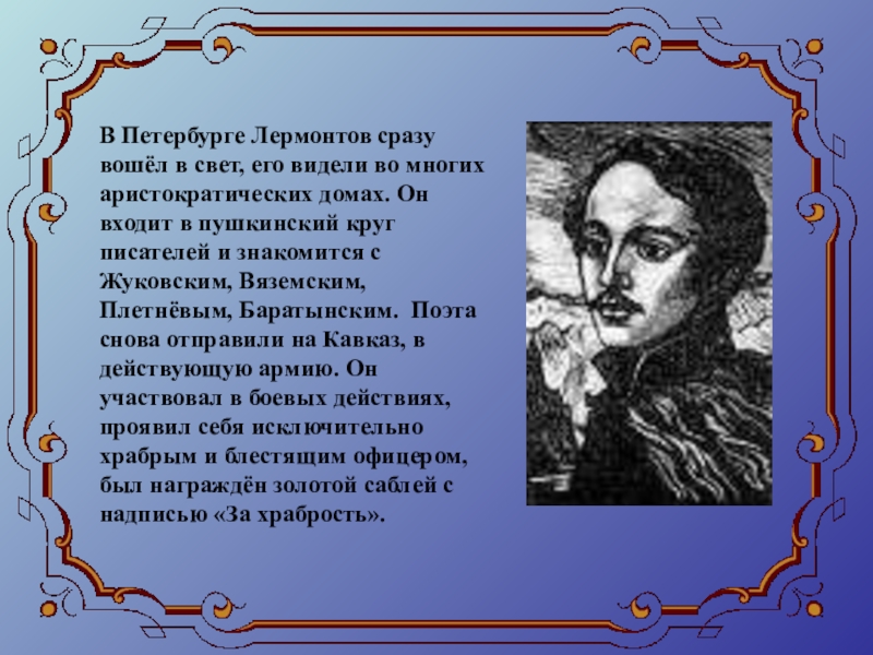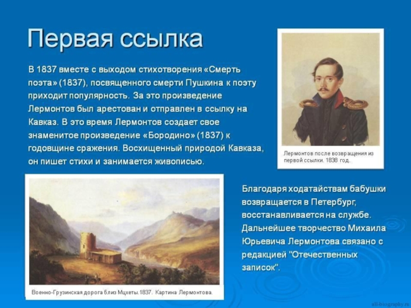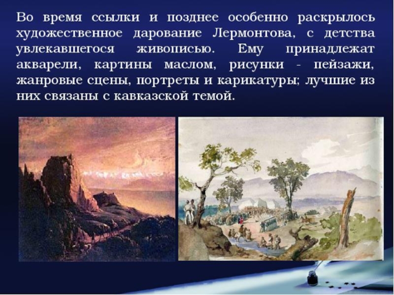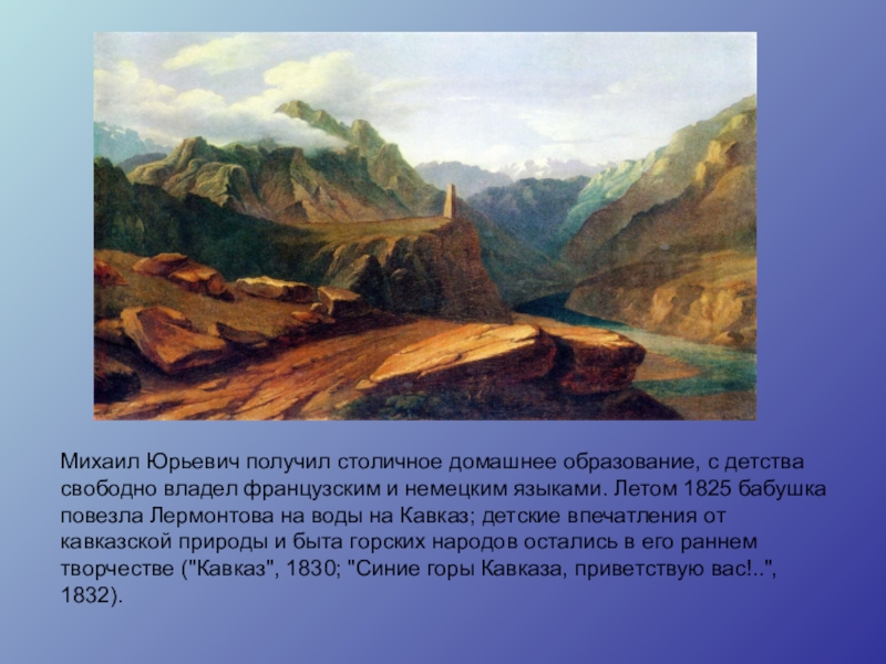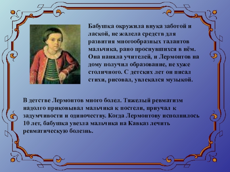 В детстве Лермонтов много болел. Тяжелый ревматизм надолго приковывал мальчика к постели, приучал к задумчивости и одиночеству. Когда Лермонтову исполнилось 10 лет, бабушка увезла мальчика на Кавказ лечить ревматическую болезнь.