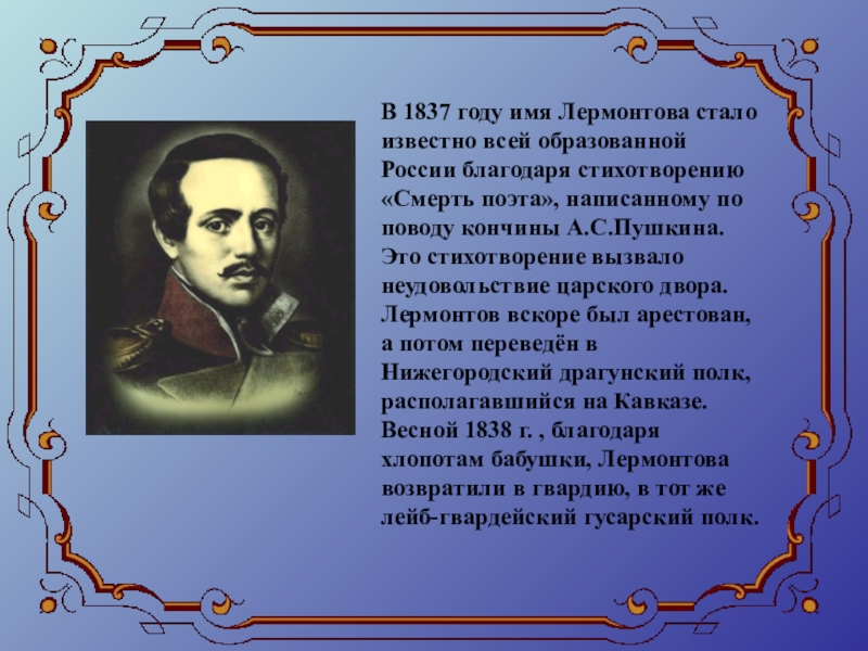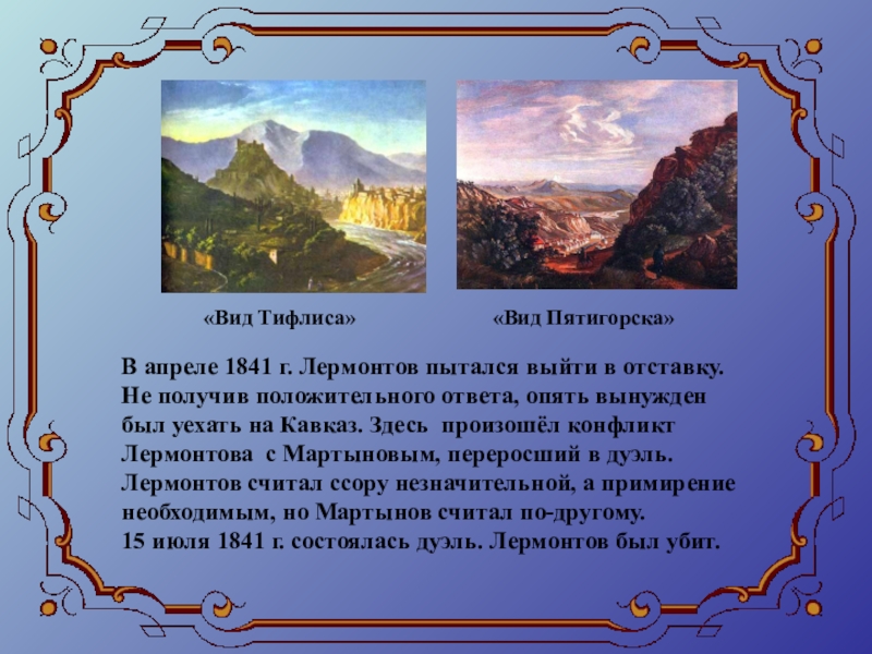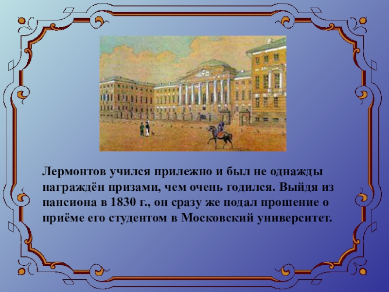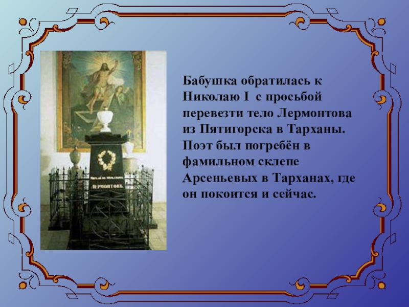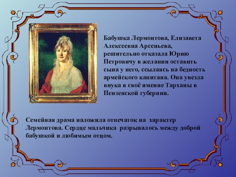 Семейная драма наложила отпечаток на характер Лермонтова. Сердце мальчика разрывалось между доброй бабушкой и любимым отцом.