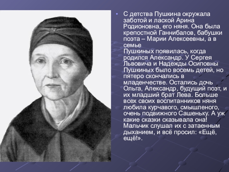 Слайд 7С детства Пушкина окружала заботой и лаской Арина Родионовна, его няня.