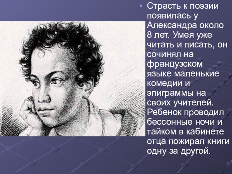 Страсть к поэзии появилась у Александра около 8 лет. Умея уже читать и писать, он сочинял на