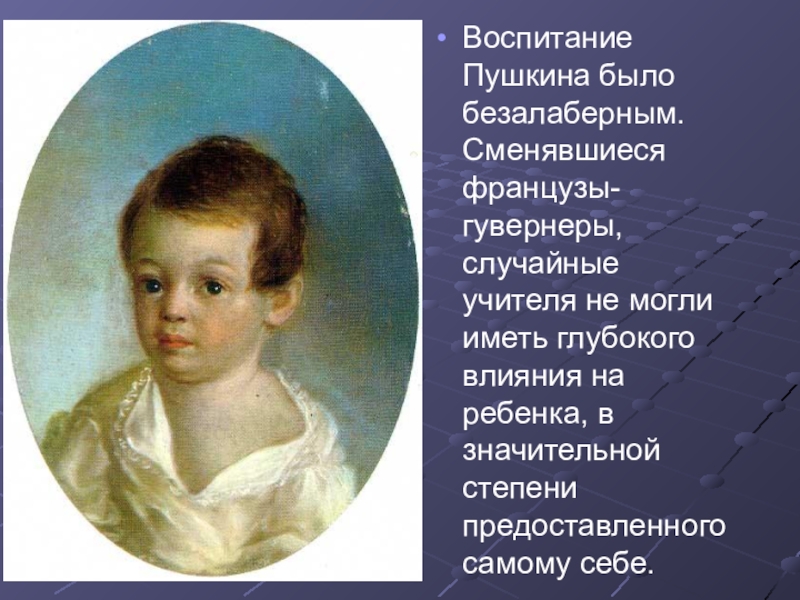 Воспитание Пушкина было безалаберным. Сменявшиеся французы-гувернеры, случайные учителя не могли иметь глубокого влияния на ребенка, в значительной