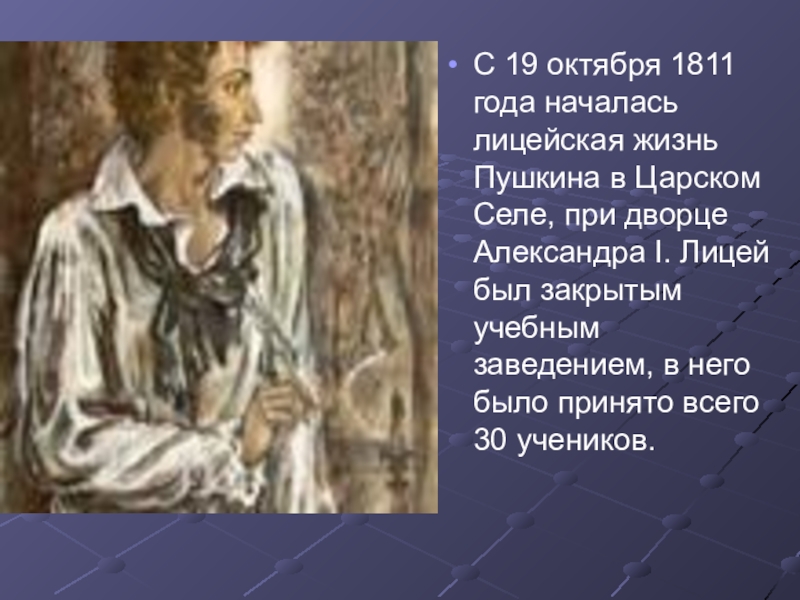 Селе, при дворце Александра I. Лицей был закрытым учебным заведением, в него было принято всего 30 учеников.