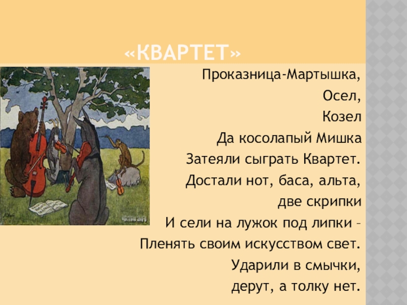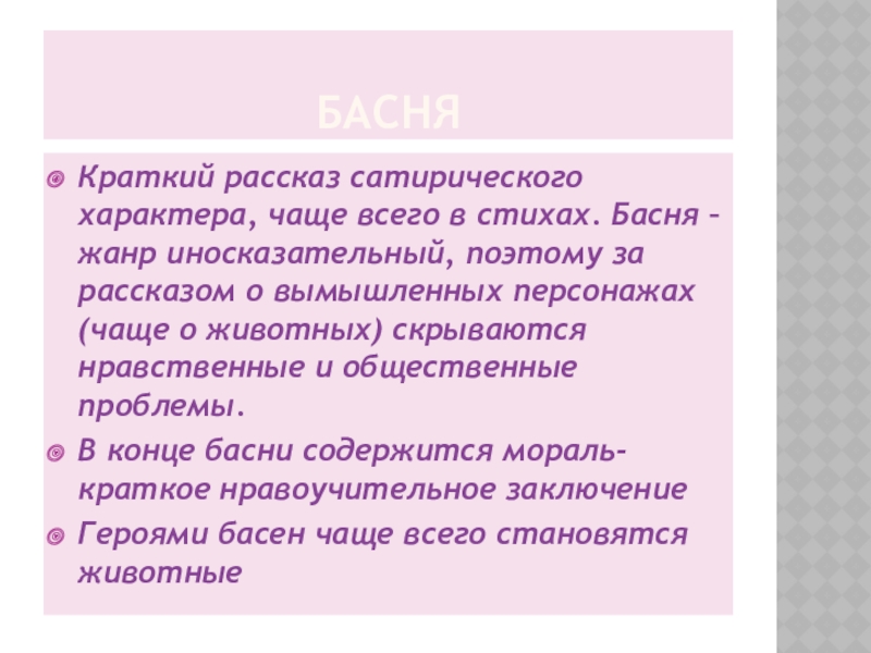 Краткий рассказ сатирического характера, чаще всего в стихах. Басня – жанр