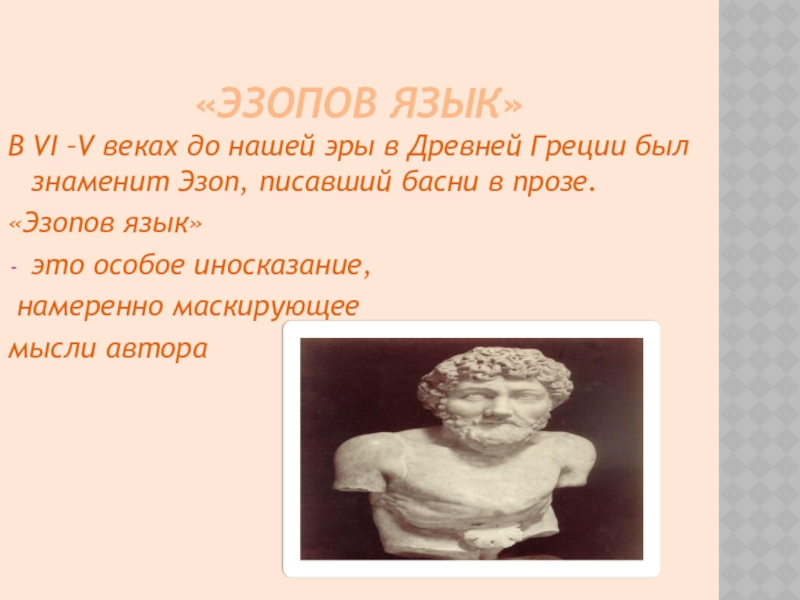 Познакомиться с жанром басни, с понятием «аллегория» и «эзопов язык»