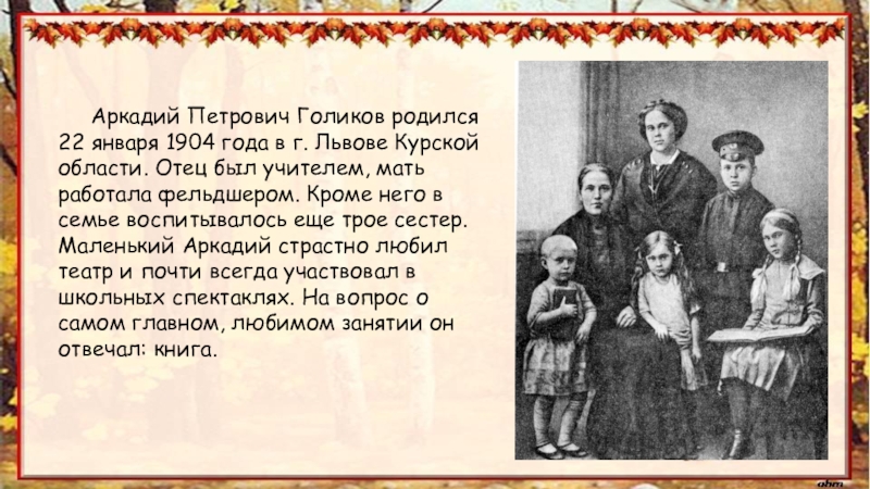 Слайд 2 Аркадий Петрович Голиков родился 22 января 1904 года в г. Львове