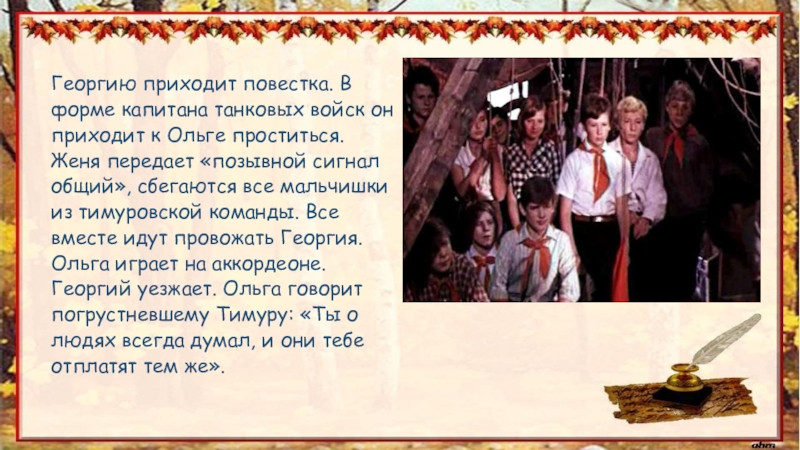 Ольге проститься. Женя передает «позывной сигнал общий», сбегаются все мальчишки из тимуровской команды. Все вместе идут провожать Георгия. Ольга играет на аккордеоне. Георгий уезжает. Ольга говорит погрустневшему Тимуру: «Ты о людях всегда думал, и они тебе отплатят тем же».