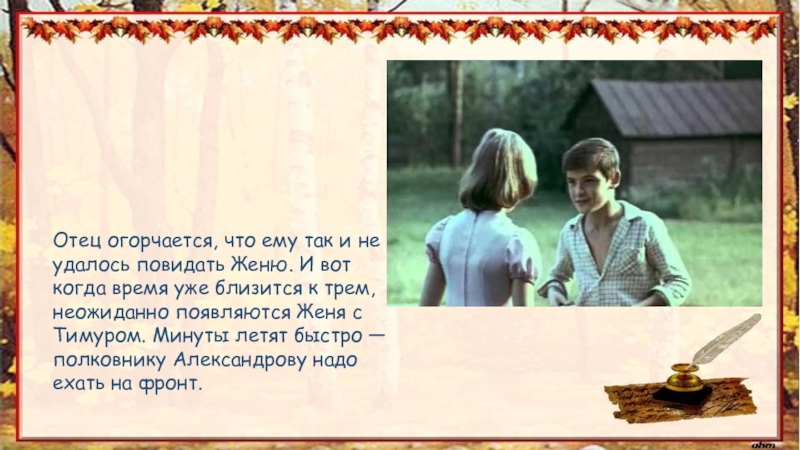 Слайд 21Отец огорчается, что ему так и не удалось повидать Женю. И