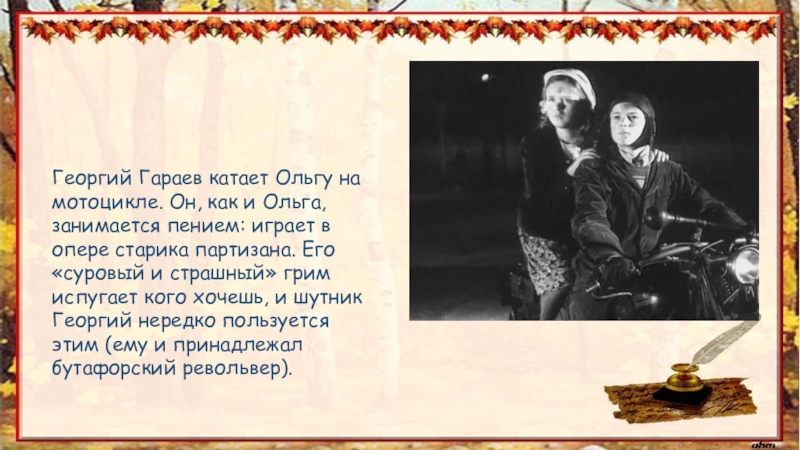Слайд 15Георгий Гараев катает Ольгу на мотоцикле. Он, как и Ольга, занимается