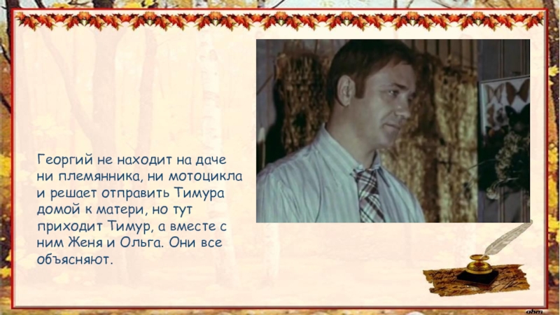 Слайд 22Георгий не находит на даче ни племянника, ни мотоцикла и решает