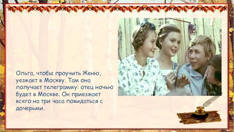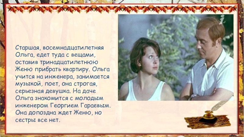 Слайд 7Старшая, восемнадцатилетняя Ольга, едет туда с вещами, оставив тринадцатилетнюю Женю прибрать