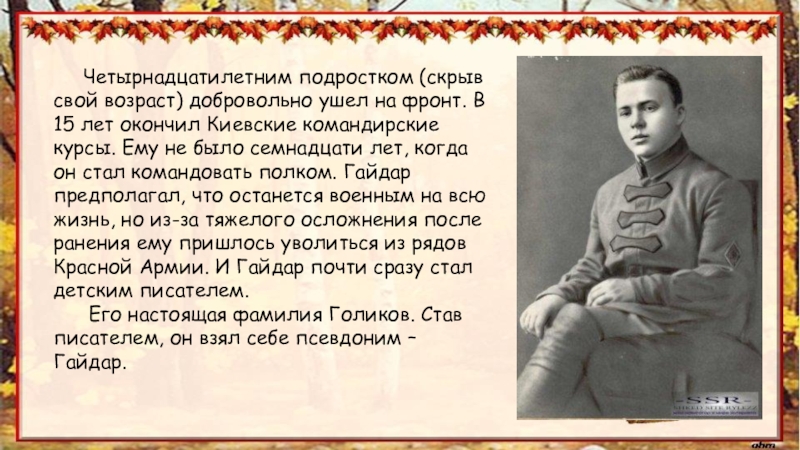 лет окончил Киевские командирские курсы. Ему не было семнадцати лет, когда он стал командовать полком. Гайдар предполагал, что останется военным на всю жизнь, но из-за тяжелого осложнения после ранения ему пришлось уволиться из рядов Красной Армии. И Гайдар почти сразу стал детским писателем.