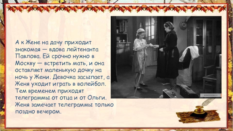 Слайд 19А к Жене на дачу приходит знакомая — вдова лейтенанта Павлова.