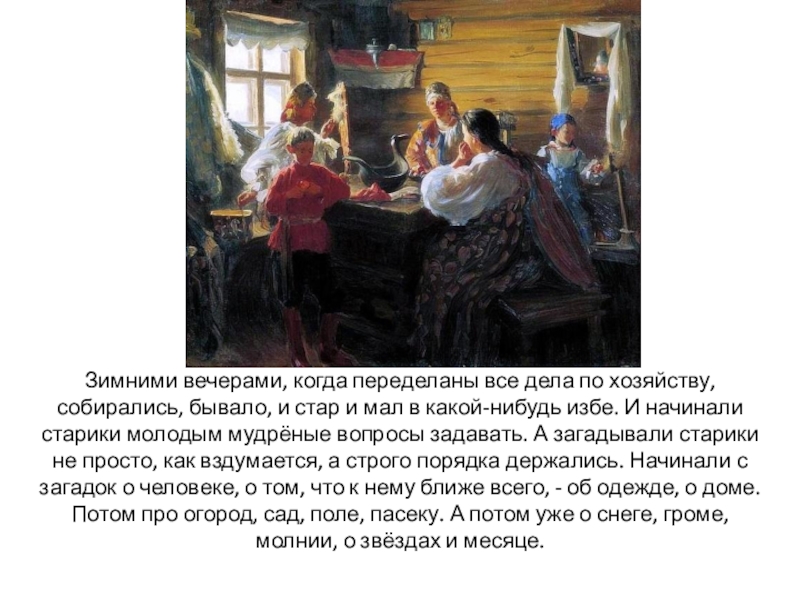 Слайд 6Зимними вечерами, когда переделаны все дела по хозяйству, собирались, бывало, и