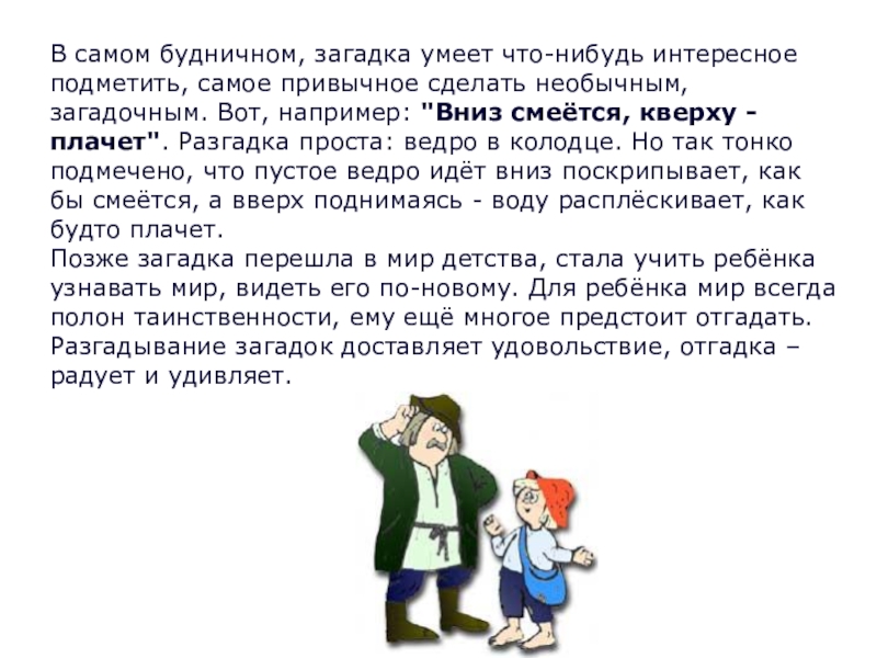 необычным, загадочным. Вот, например: "Вниз смеётся, кверху - плачет". Разгадка проста: ведро в колодце. Но так тонко подмечено, что пустое ведро идёт вниз поскрипывает, как бы смеётся, а вверх поднимаясь - воду расплёскивает, как будто плачет.