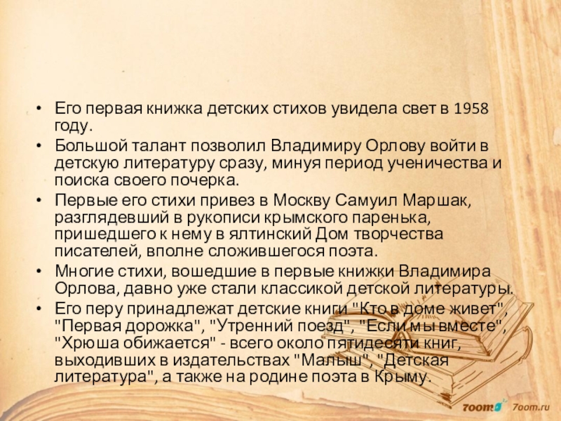 Слайд 9Его первая книжка детских стихов увидела свет в 1958 году.