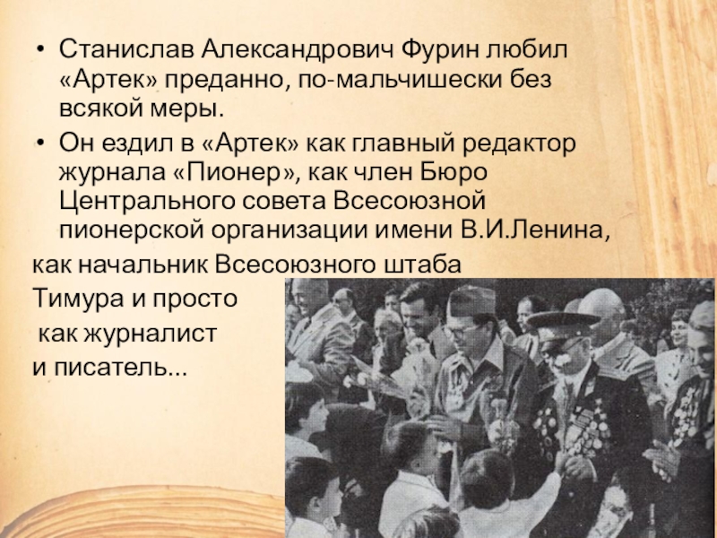 Слайд 6Станислав Александрович Фурин любил «Артек» преданно, по-мальчишески без всякой меры.