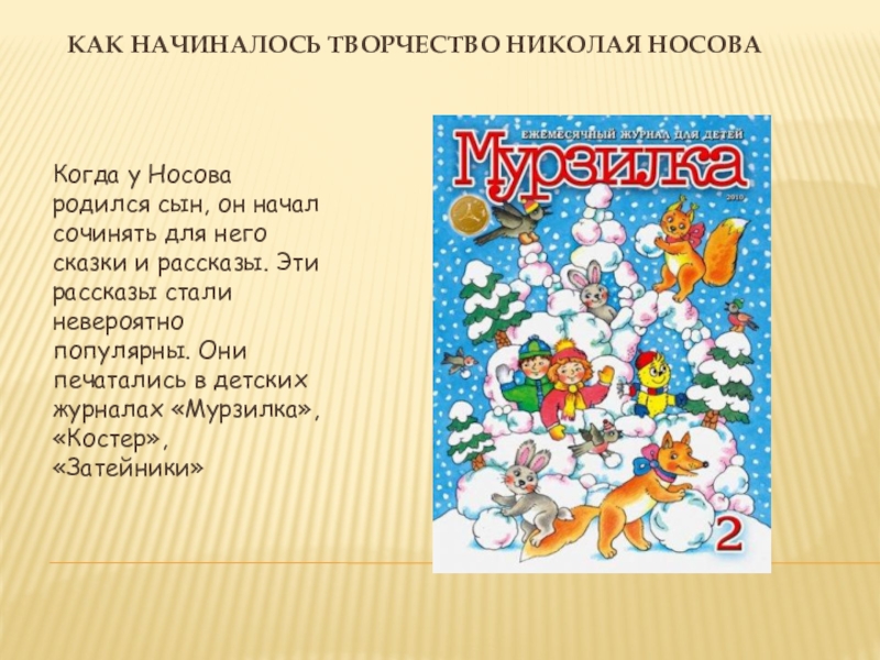 Носова родился сын, он начал сочинять для него сказки и рассказы. Эти рассказы стали невероятно популярны. Они печатались в детских журналах «Мурзилка», «Костер», «Затейники»