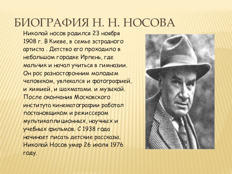 Киеве, в семье эстрадного артиста . Детство его проходило в небольшом городке Ирпень, где мальчик и начал учиться в гимназии. Он рос разносторонним молодым человеком, увлекался и фотографией, и химией, и шахматами. и музыкой. После окончания Московского института кинематографии работал постановщиком и режиссером мультикаплиционных, научных и учебных фильмов. С 1938 года начинает писать детские рассказы. Николай Носов умер 26 июля 1976 году.