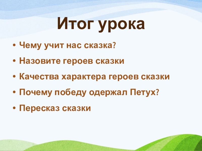 Итог урокаЧему учит нас сказка?Назовите героев сказкиКачества характера героев сказкиПочему победу одержал Петух?Пересказ сказки