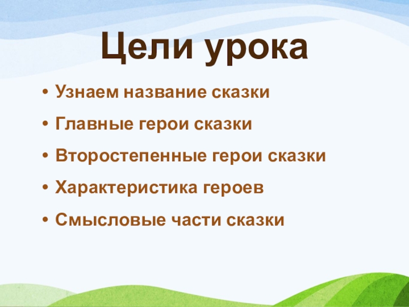 Цели урокаУзнаем название сказкиГлавные герои сказкиВторостепенные герои сказкиХарактеристика героевСмысловые части сказки