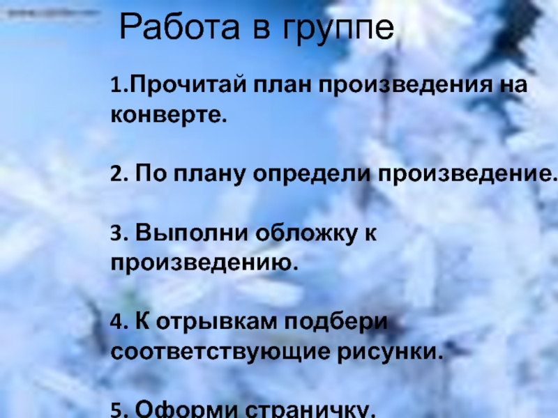 Работа в группе1.Прочитай план произведения на конверте.2. По плану определи произведение.3.