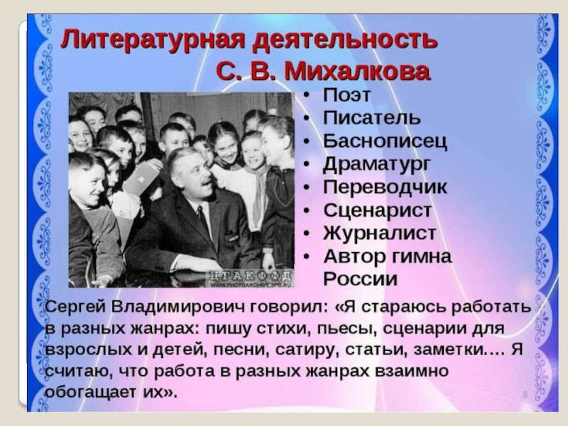 Презентация, доклад по литературному чтению 2 класс. УМК Школа России Сергей Михалков