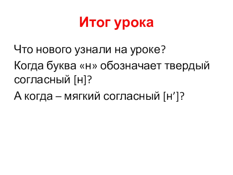 Итог урокаЧто нового узнали на уроке?Когда буква «н» обозначает твердый согласный [н]?А когда – мягкий согласный [н’]?