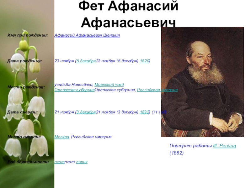 1873 — возвращено дворянство и фамилия Шеншин. Литературные произведения и переводы поэт и в дальнейшем подписывал фамилией Фет.