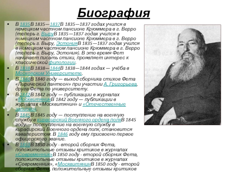 г. Верро (теперь г. ВыруВ 1835—1837 годах учился в немецком частном пансионе Крюммера в г. Верро (теперь г. Выру, ЭстонияВ 1835—1837 годах учился в немецком частном пансионе Крюммера в г. Верро (теперь г. Выру, Эстония). В это время Фет начинает писать стихи, проявляет интерес к классической филологии.