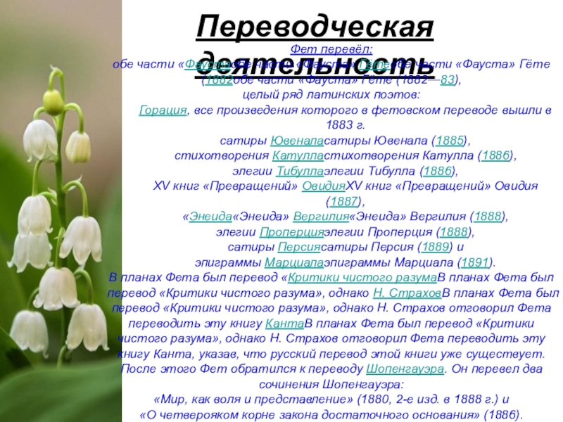 В планах Фета был перевод «Критики чистого разумаВ планах Фета был перевод «Критики чистого разума», однако Н. СтраховВ планах Фета был перевод «Критики чистого разума», однако Н. Страхов отговорил Фета переводить эту книгу КантаВ планах Фета был перевод «Критики чистого разума», однако Н. Страхов отговорил Фета переводить эту книгу Канта, указав, что русский перевод этой книги уже существует. После этого Фет обратился к переводу Шопенгауэра. Он перевел два сочинения Шопенгауэра: