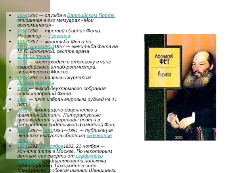 18571857 — женитьба Фета на М. П. Боткиной1857 — женитьба Фета на М. П. Боткиной, сестре врача С. П. Боткина