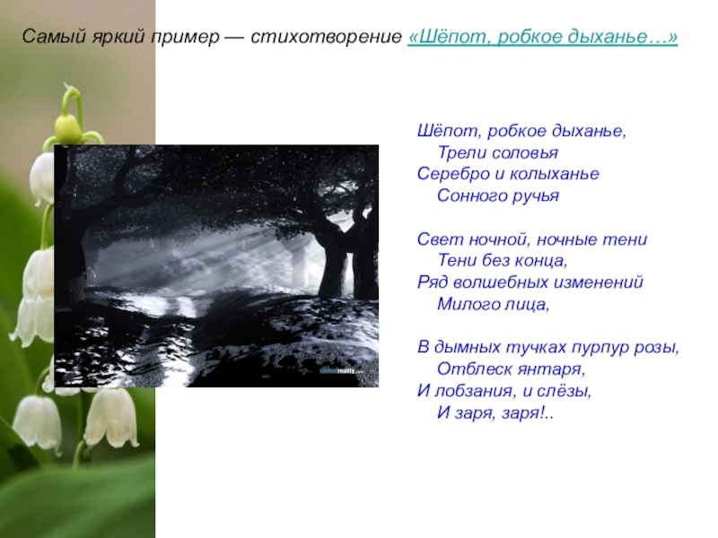 Слайд 7Самый яркий пример — стихотворение «Шёпот, робкое дыханье…».