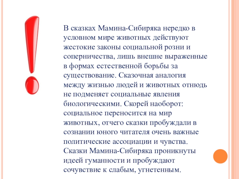 социальной розни и соперничества, лишь внешне выраженные в формах естественной борьбы за существование. Сказочная аналогия между жизнью людей и животных отнюдь не подменяет социальные явления биологическими. Скорей наоборот: социальное переносится на мир животных, отчего сказки пробуждали в сознании юного читателя очень важные политические ассоциации и чувства. Сказки Мамина-Сибиряка проникнуты идеей гуманности и пробуждают сочувствие к слабым, угнетенным.