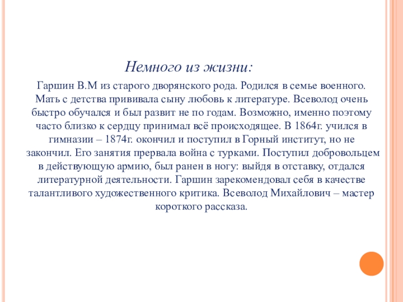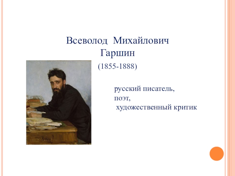 военного. Мать с детства прививала сыну любовь к литературе. Всеволод очень быстро обучался и был развит не по годам. Возможно, именно поэтому часто близко к сердцу принимал всё происходящее. В 1864г. учился в гимназии – 1874г. окончил и поступил в Горный институт, но не закончил. Его занятия прервала война с турками. Поступил добровольцем в действующую армию, был ранен в ногу: выйдя в отставку, отдался литературной деятельности. Гаршин зарекомендовал себя в качестве талантливого художественного критика. Всеволод Михайлович – мастер короткого рассказа.