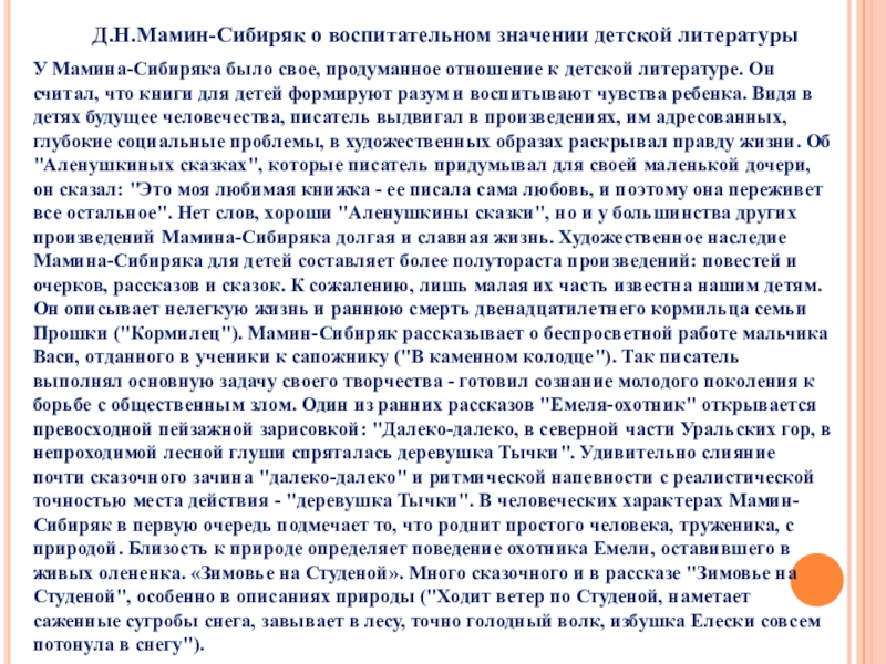 к детской литературе. Он считал, что книги для детей формируют разум и воспитывают чувства ребенка. Видя в детях будущее человечества, писатель выдвигал в произведениях, им адресованных, глубокие социальные проблемы, в художественных образах раскрывал правду жизни. Об "Аленушкиных сказках", которые писатель придумывал для своей маленькой дочери, он сказал: "Это моя любимая книжка - ее писала сама любовь, и поэтому она переживет все остальное". Нет слов, хороши "Аленушкины сказки", но и у большинства других произведений Мамина-Сибиряка долгая и славная жизнь. Художественное наследие Мамина-Сибиряка для детей составляет более полутораста произведений: повестей и очерков, рассказов и сказок. К сожалению, лишь малая их часть известна нашим детям. Он описывает нелегкую жизнь и раннюю смерть двенадцатилетнего кормильца семьи Прошки ("Кормилец"). Мамин-Сибиряк рассказывает о беспросветной работе мальчика Васи, отданного в ученики к сапожнику ("В каменном колодце"). Так писатель выполнял основную задачу своего творчества - готовил сознание молодого поколения к борьбе с общественным злом. Один из ранних рассказов "Емеля-охотник" открывается превосходной пейзажной зарисовкой: "Далеко-далеко, в северной части Уральских гор, в непроходимой лесной глуши спряталась деревушка Тычки". Удивительно слияние почти сказочного зачина "далеко-далеко" и ритмической напевности с реалистической точностью места действия - "деревушка Тычки". В человеческих характерах Мамин-Сибиряк в первую очередь подмечает то, что роднит простого человека, труженика, с природой. Близость к природе определяет поведение охотника Емели, оставившего в живых олененка. «Зимовье на Студеной». Много сказочного и в рассказе "Зимовье на Студеной", особенно в описаниях природы ("Ходит ветер по Студеной, наметает саженные сугробы снега, завывает в лесу, точно голодный волк, избушка Елески совсем потонула в снегу").
