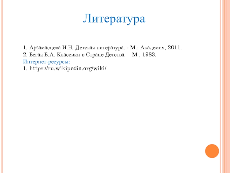 1. Арзамасцева И.Н. Детская литература. - М.: Академия, 2011.