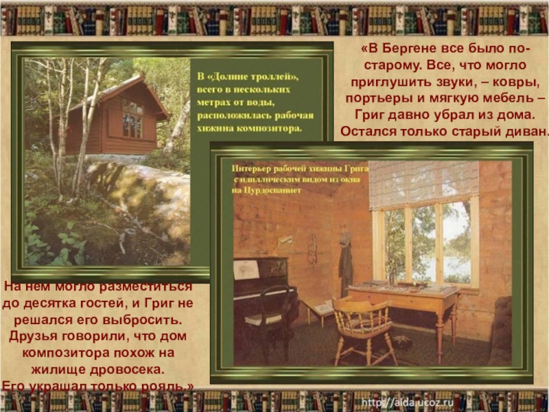 На нем могло разместиться до десятка гостей, и Григ не решался его выбросить. Друзья говорили, что дом композитора похож на жилище дровосека.
