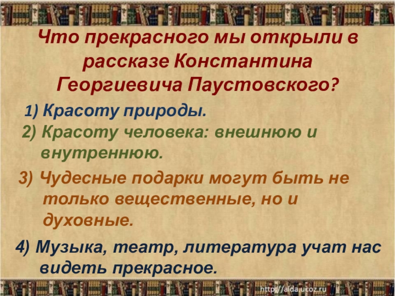 Это сайт презентаций, где можно хранить и обмениваться своими презентациями, докладами, проектами, шаблонами в формате PowerPoint с другими пользователями. Мы помогаем школьникам, студентам, учителям, преподавателям хранить и обмениваться учебными материалами.