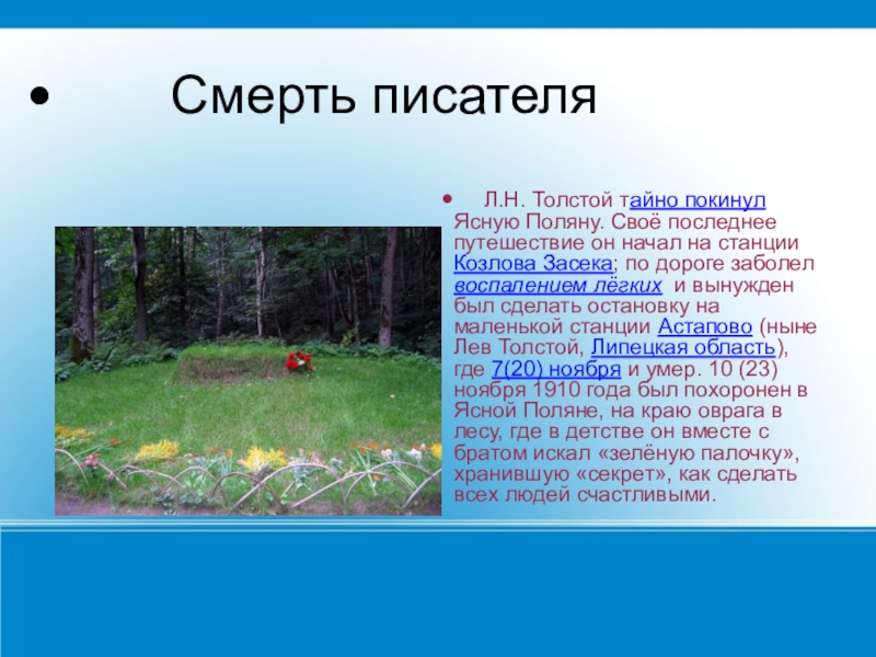 покинул Ясную Поляну. Своё последнее путешествие он начал на станции Козлова Засека; по дороге заболел воспалением лёгких и вынужден был сделать остановку на маленькой станции Астапово (ныне Лев Толстой, Липецкая область), где 7(20) ноября и умер. 10 (23) ноября 1910 года был похоронен в Ясной Поляне, на краю оврага в лесу, где в детстве он вместе с братом искал «зелёную палочку», хранившую «секрет», как сделать всех людей счастливыми.