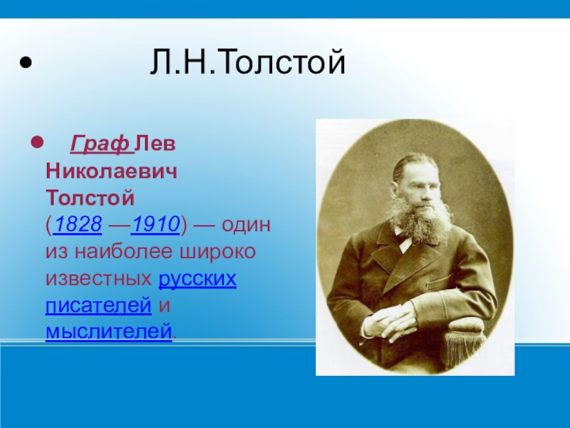 Л.Н.Толстой Граф Лев Николаевич Толстой (1828 —1910) — один из наиболее широко известных русских писателей и мыслителей.