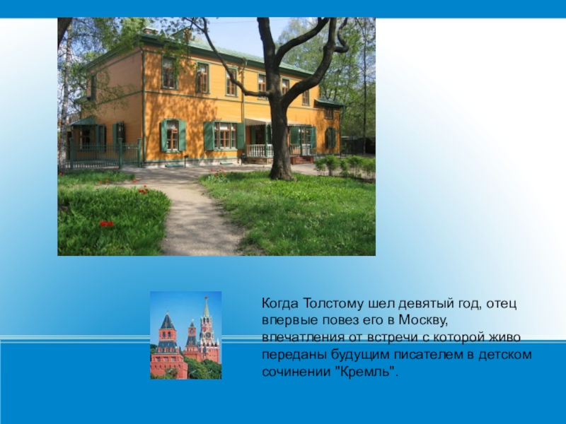 Слайд 4Когда Толстому шел девятый год, отец впервые повез его в Москву,