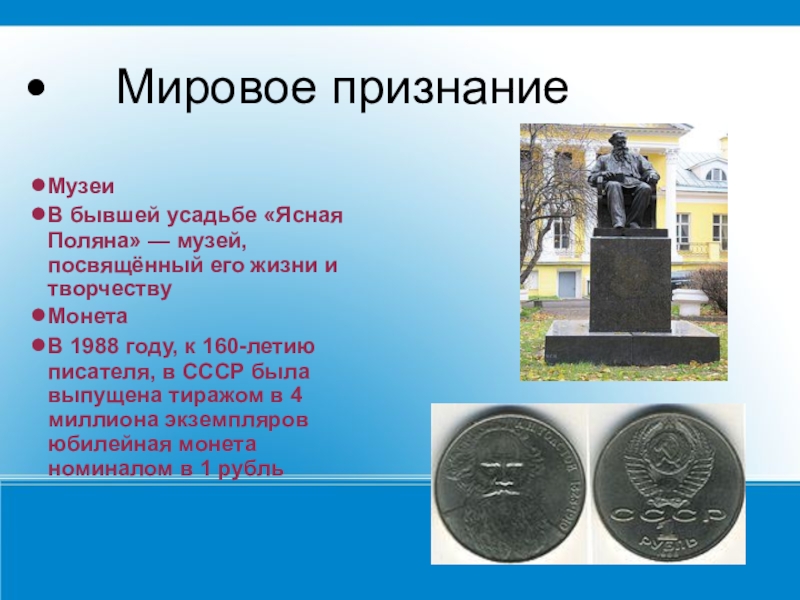 Мировое признаниеМузеиВ бывшей усадьбе «Ясная Поляна» — музей, посвящённый его жизни и творчествуМонетаВ 1988 году,