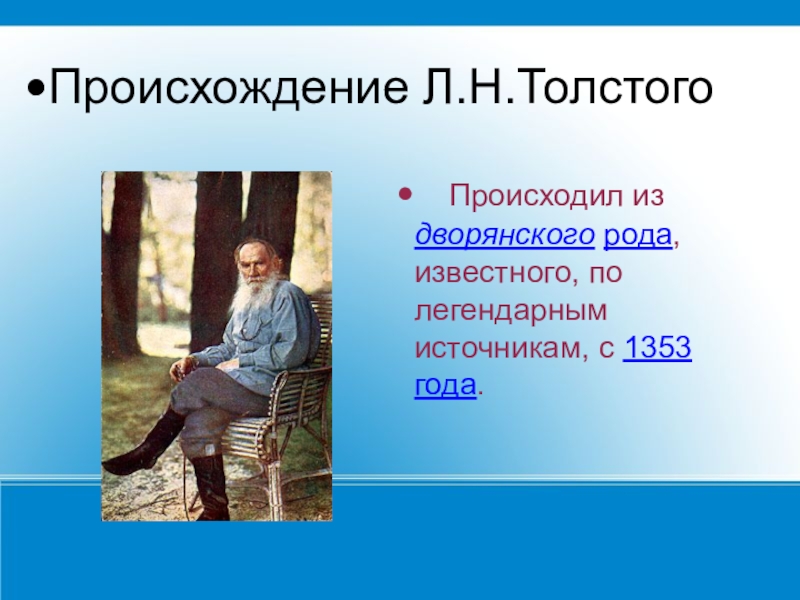 Происхождение Л.Н.Толстого  Происходил из дворянского рода, известного, по легендарным источникам, с 1353 года.